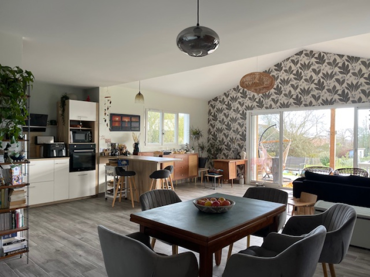 Proche Montfort-en-chalosse, maison contemporaine (2022) à ossature bois de 105 m² environ comprenant grand salon/séjour communiquant avec la terrasse couverte par des baies vitrées à galandage,...